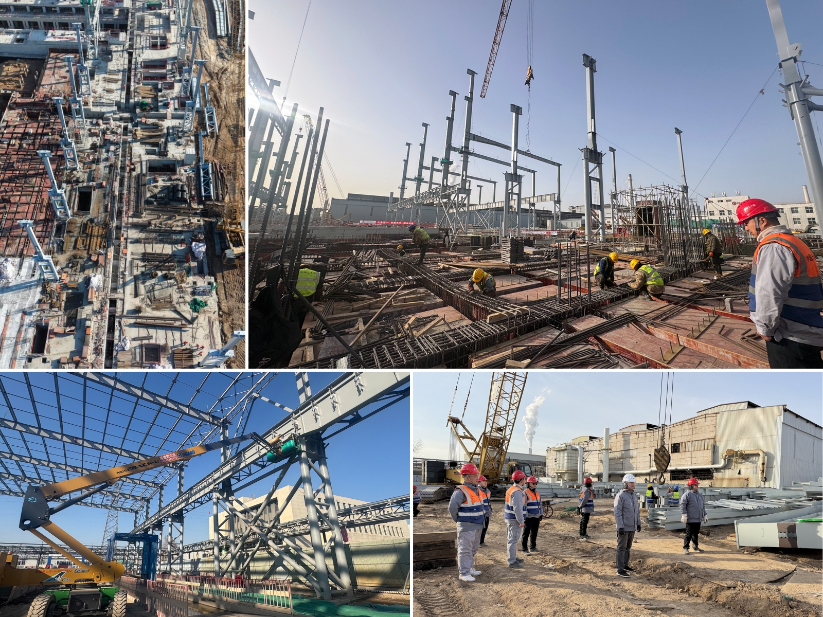山西太钢不锈钢热连轧生产线优化升级改造项目100余名建设者坚守岗位,顺利完成粗轧R2区域接旋流池冲渣沟顶板混凝土浇筑关键节点;钢结构专业,4台大型履带吊高效作业,高效完成加热炉钢柱及主轧线钢柱安装;土建专业,完成粗轧电气室±0顶板浇筑及粗轧外接电缆隧道的开挖,为节后牌坊安装、电气安装创造了有利条件。