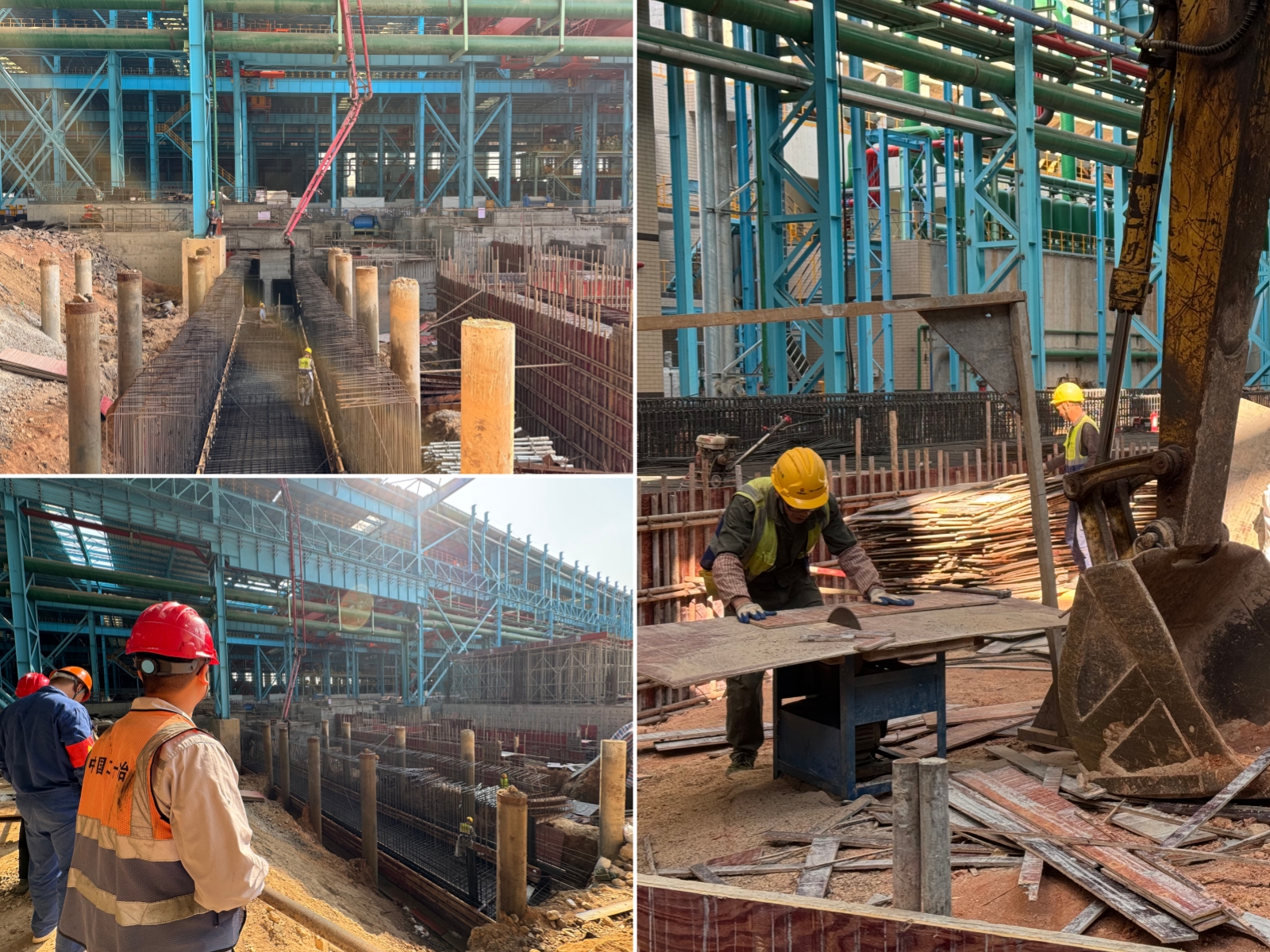 印尼OBI园区ONC湿法残积矿项目、印尼OBI园区中区公共道路工程项目、印尼OBI电厂排水明渠渗水修复工程项目2名管理人员、12名中方施工人员坚守一线,道路项目钢筋工高温下精绑钢筋,残积矿项目吊装、焊接作业精准推进,明渠修复项目完成注浆材料入库,为后续施工夯实物资基础。