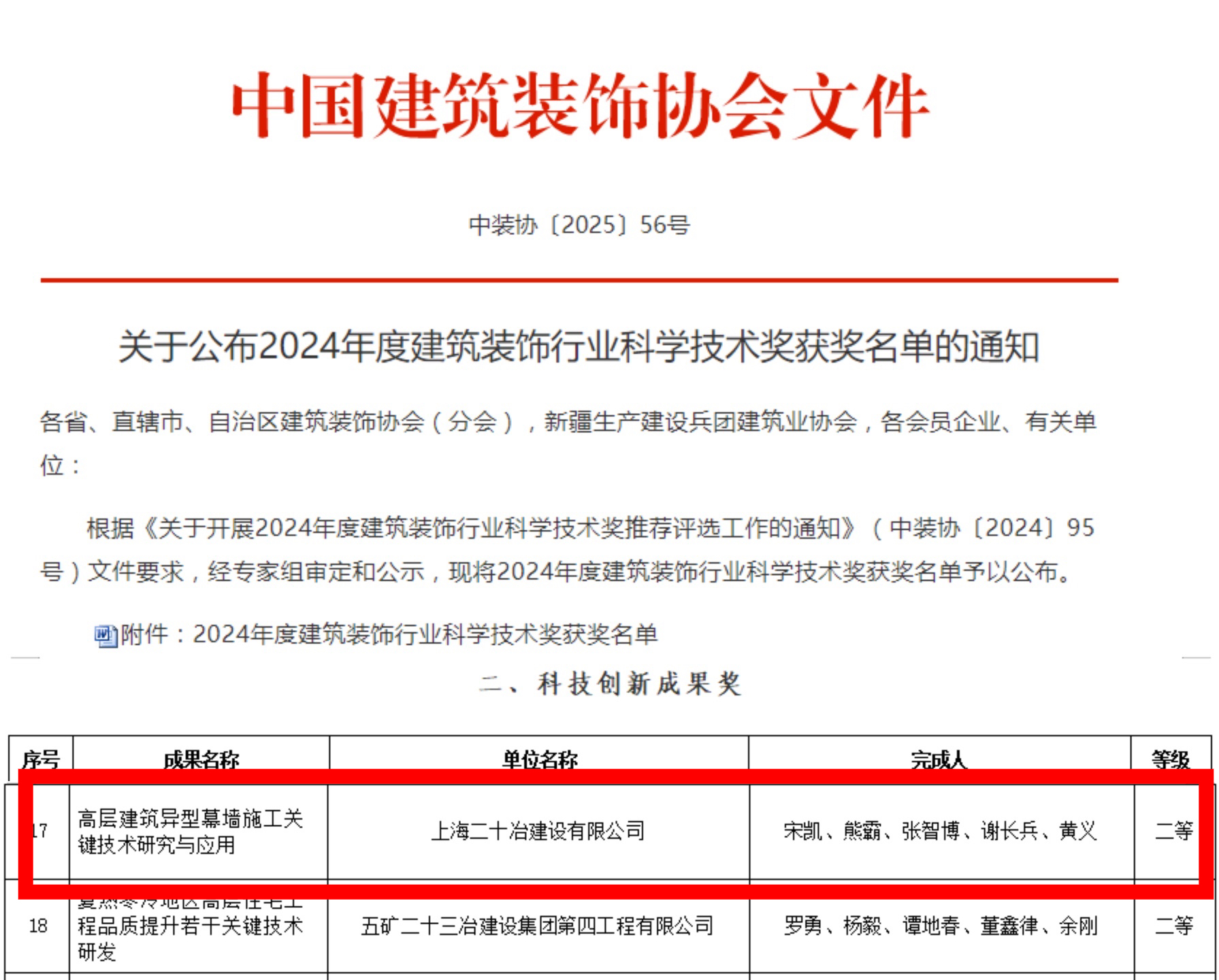 8月8日,从中国建筑装饰协会传来喜讯,上海申博太阳城“高层建筑异型幕墙施工关键技术研究与应用”荣获2024年度建筑装饰行业科学技术奖科技创新成果奖二等奖。