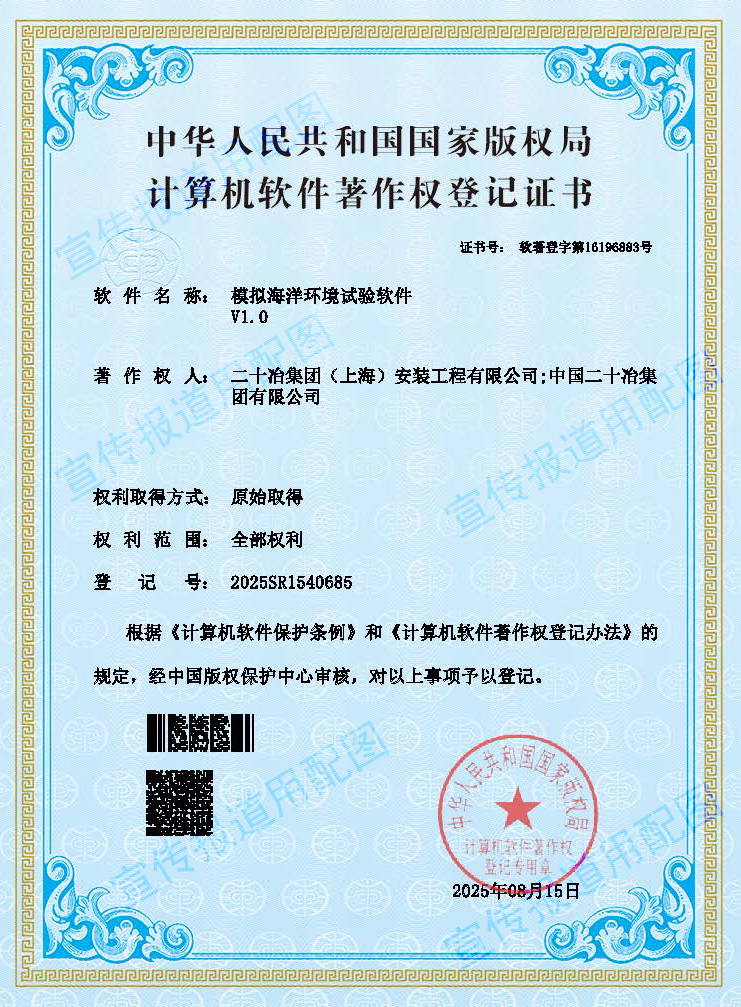 8月18日,安装公司收到国家版权局发来的计算机软件著作权登记证书, 标志着王展英电子技术创新工作室与徐宁智能建造创新工作室共同合作完成的海洋环境模拟装置项目进入技术验收后的创优阶段。