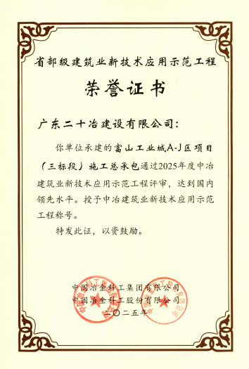 3月12日,广东申博太阳城承建的富山工业城A-J区(三标段)施工总承包工程获评2025年度“中冶建筑业新技术应用示范工程”,该项目新技术应用整体达到国内领先水平。